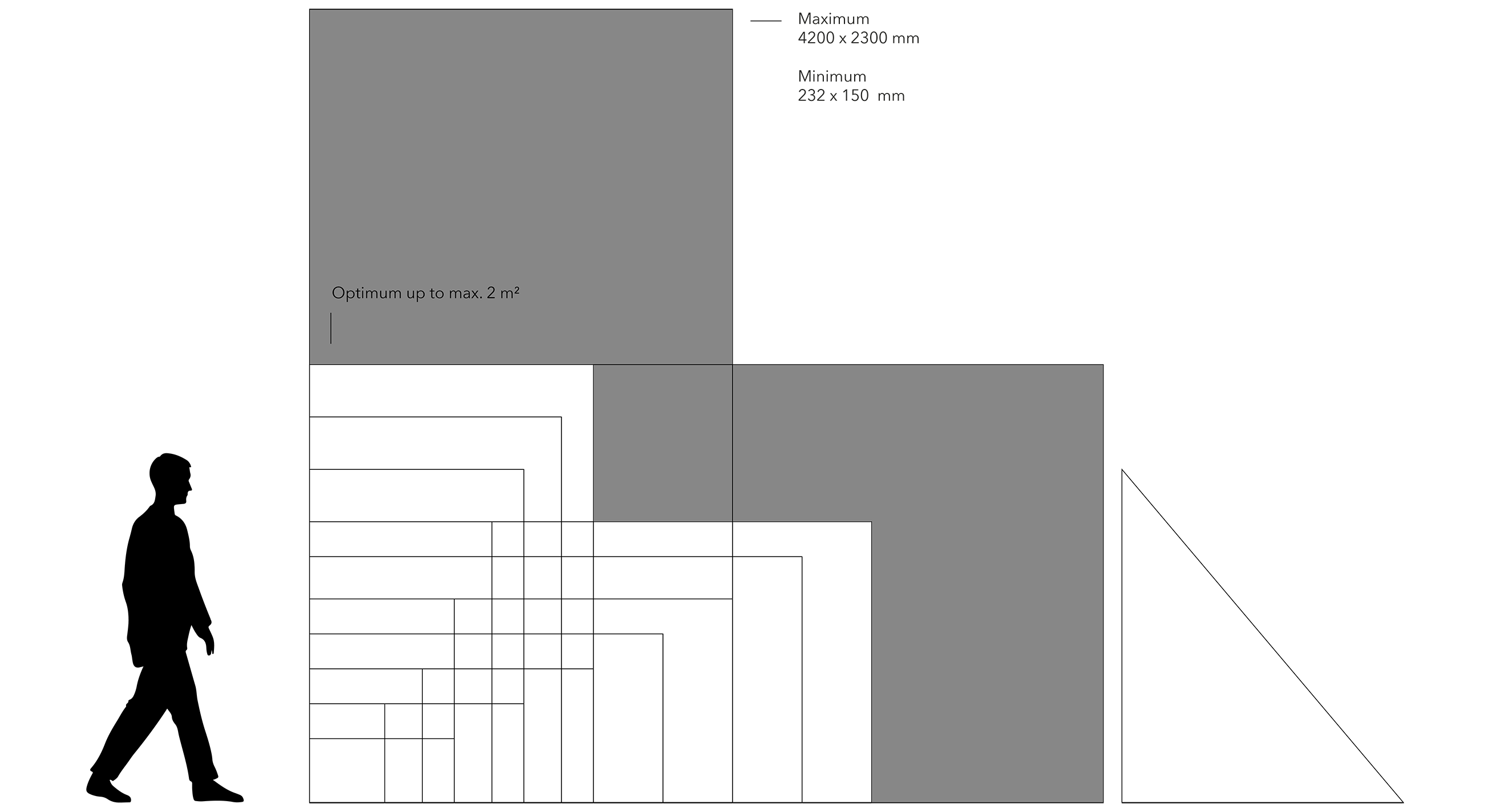 Dimensions larger than 2 m² may incur an additional charge due to the complexity of production, assembly (weight) and transport.Maximum dimensions are 4200 x 2300 mm